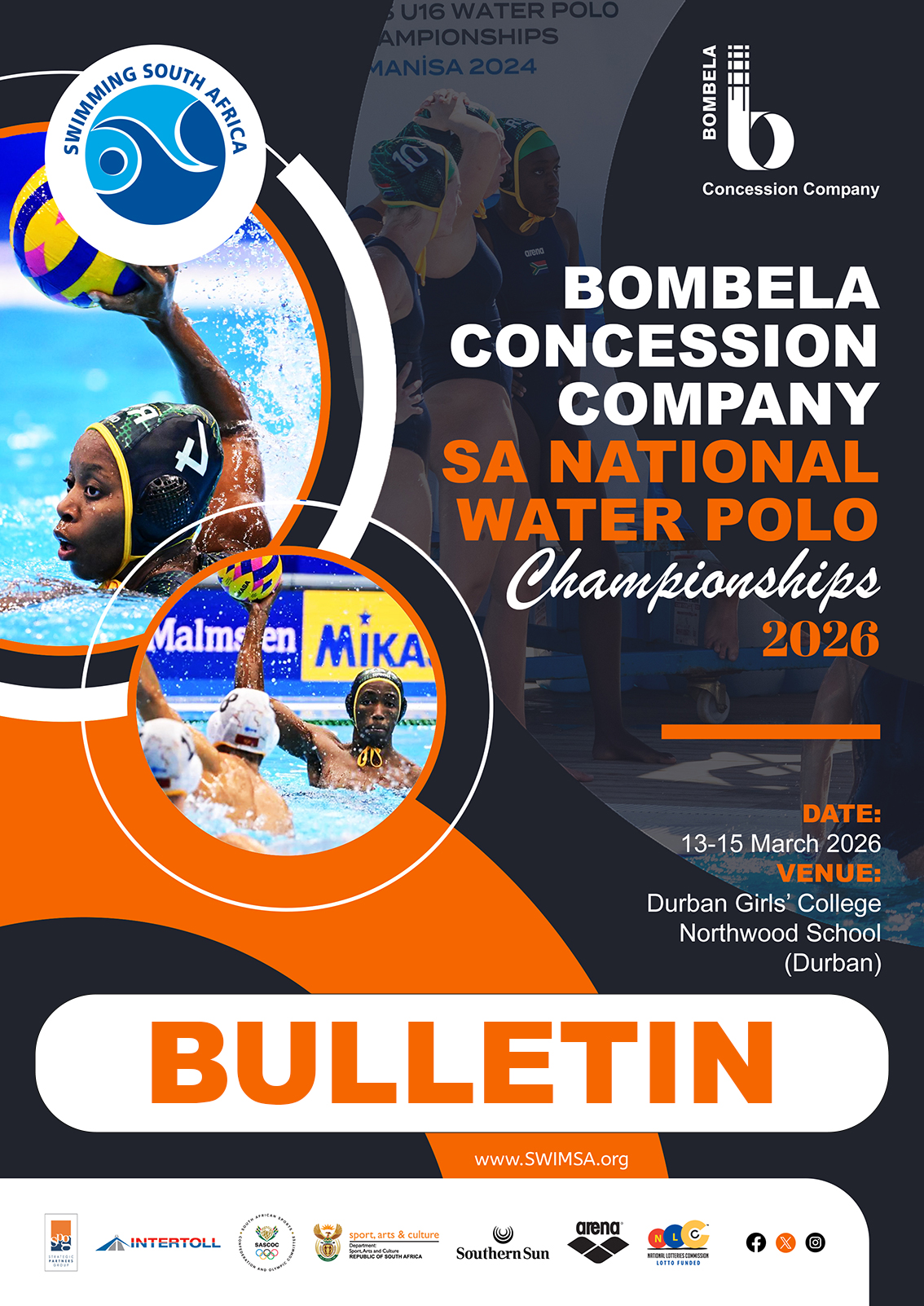 Bombela Concession Company SA National Water Polo Championships - Durban Girls’ College & Northwood School (Durban), 13-15 March 2026 >>> OFFICIAL BULLETIN: https://swimsa.org/events-results/all-events/bombela-concession-company-sa-national-water-polo-championships/sa-national-water-polo-championships-2026-bulletin.pdf